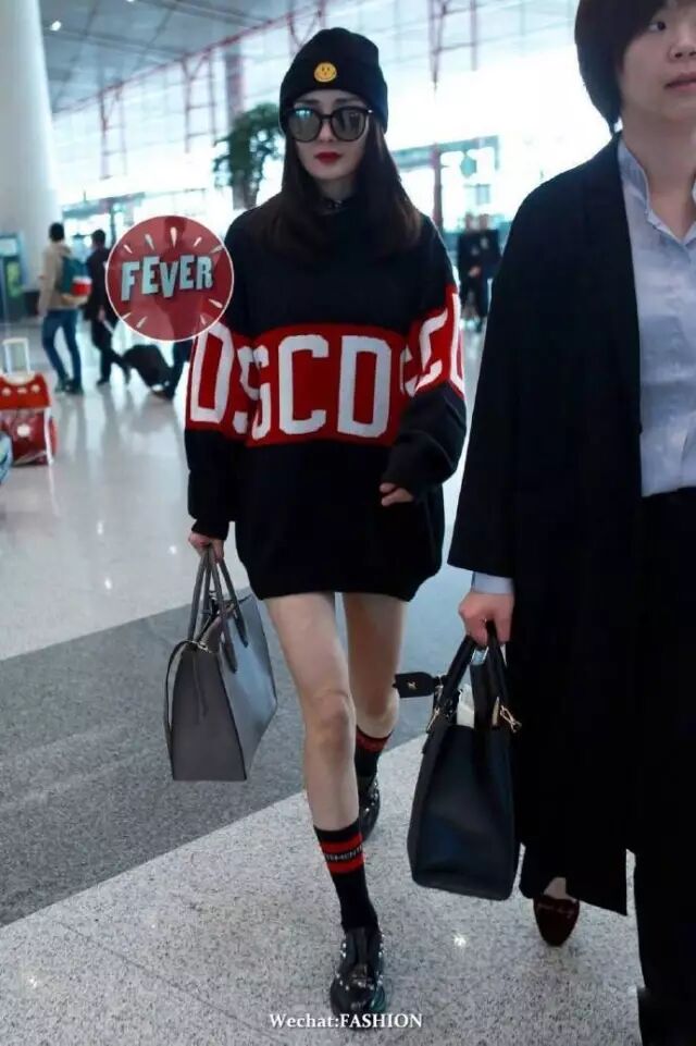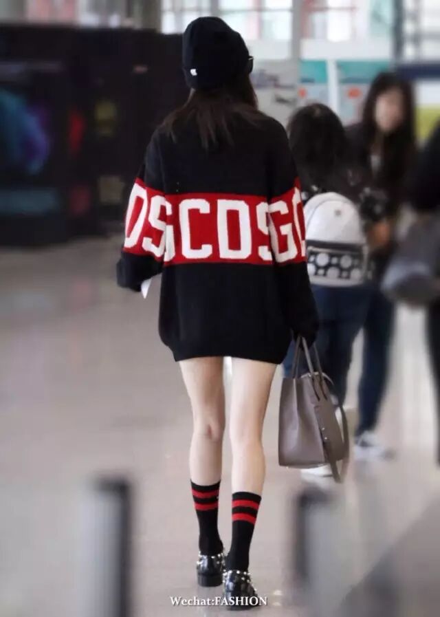 爆款王杨幂又来安利毛衣了,这身字母图案oversized毛衣单穿,无裤装的穿法,露出纤细修长的大白腿,搭配Vetements长袜,正好红黑配很搭,毛线帽竟然也开始戴起来了!包包是她自己代言的MK大号,墨镜Gentle Monster。