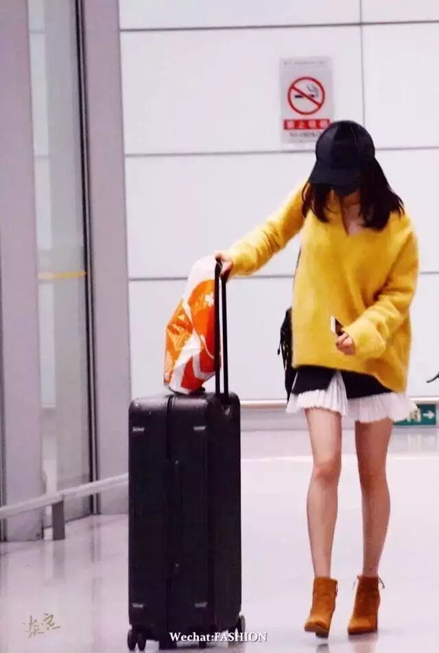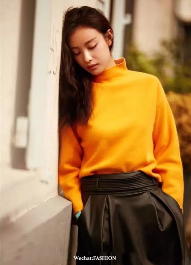 暖黄色的半高领毛衣搭配皮革短裙,好时髦。