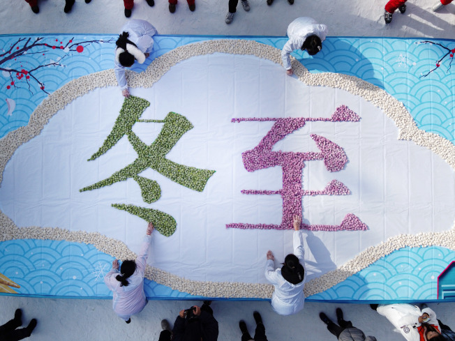 河南洛阳伏牛山滑雪场的工作人员和游客在雪地用上万个饺子拼出一个长7.32米、宽3.66米的巨型彩色饺子,用吃饺子的方式迎接冬至的到来。(中新社)