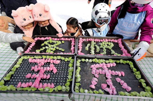 河南洛阳伏牛山滑雪场的工作人员和游客用吃饺子的方式迎接冬至。(中新社)
