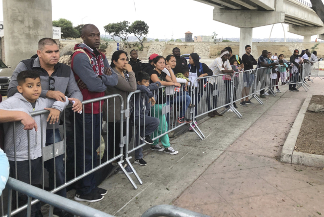 来自中南美洲的无证移民在提璜纳边界,排队等候进入美国,并申请庇护。(美联社)