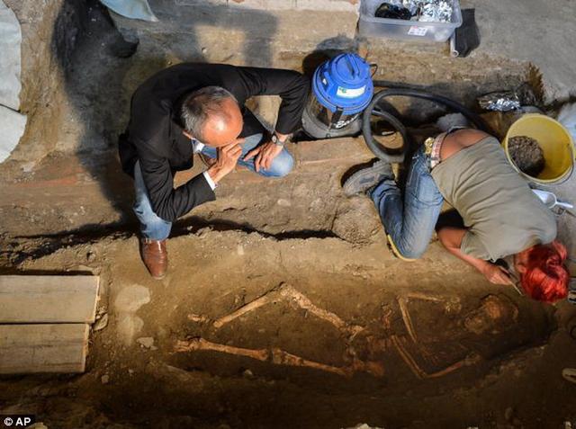 意大利历史学家西尔瓦诺-温切蒂和另一位考古学家正在Sant’Orsola修道院遗址挖掘尸骨。