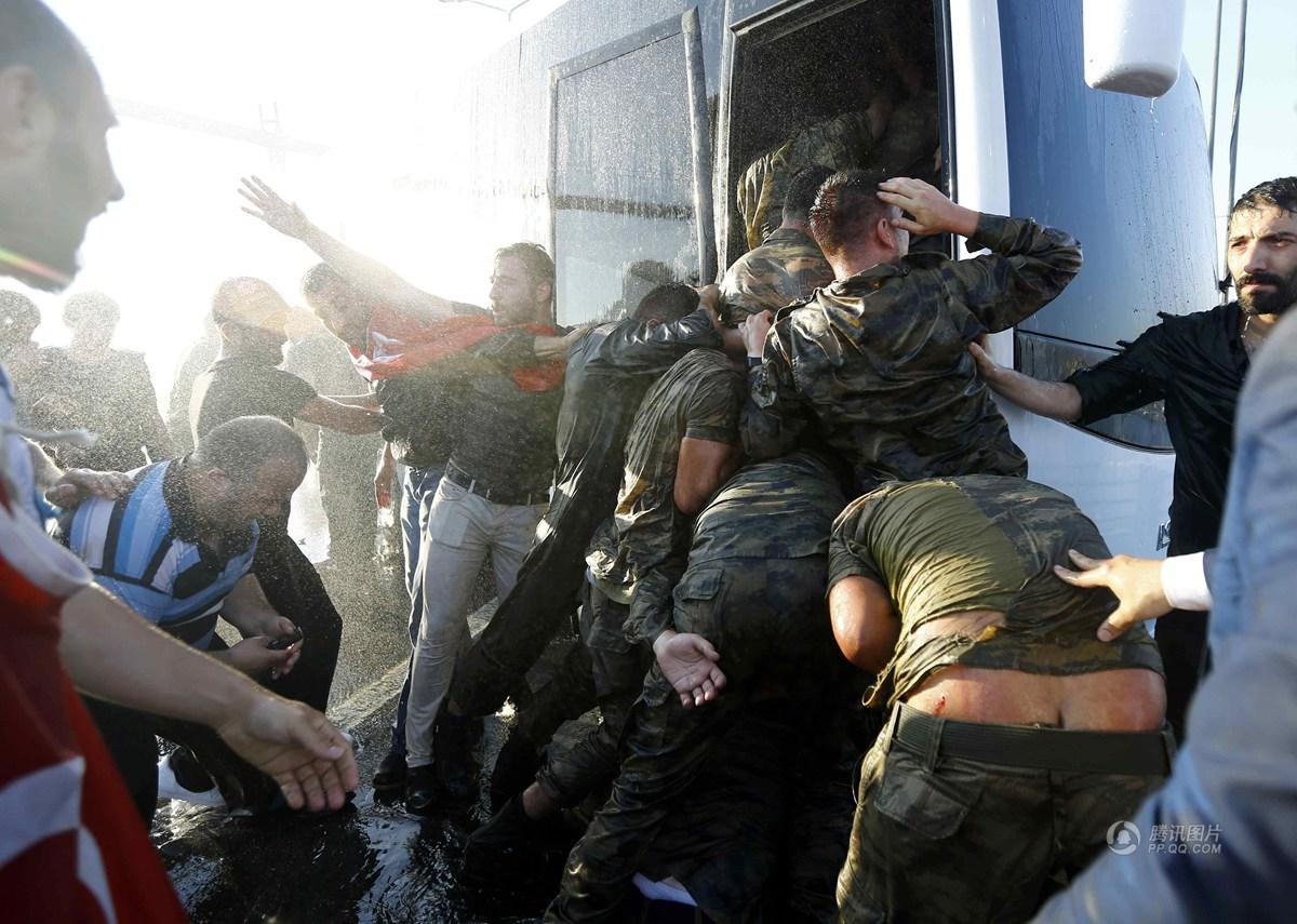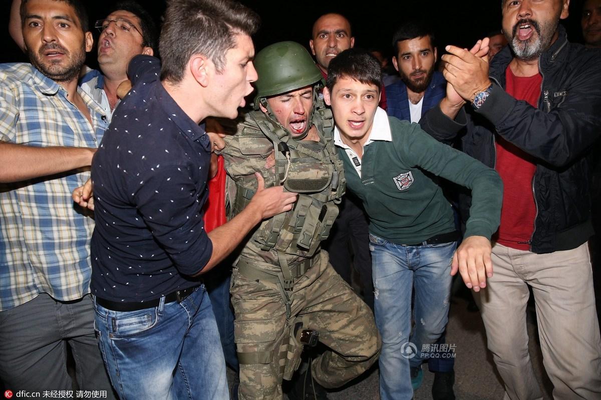 16日凌晨,土耳其安卡拉,一群土耳其士兵企图冲进土耳其广播电视公司,被抗议政变的民众揪出。