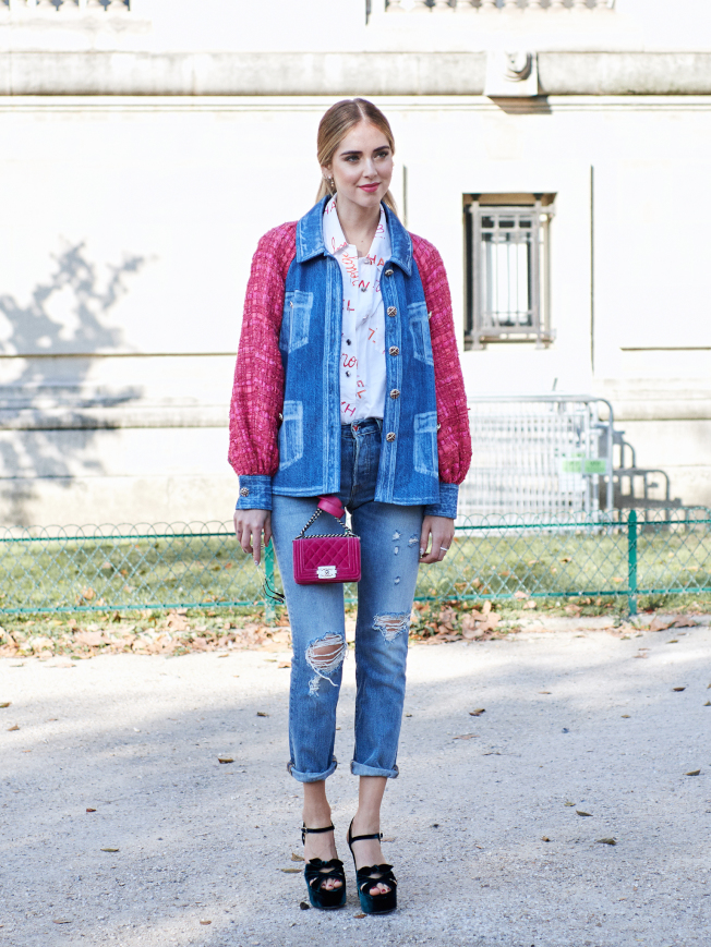 Chiara Ferragni以今年秋冬很流行的包包装饰法出现在CHANEL秀场外,搭配品牌秋冬系列粉红软呢拼接丹宁外套,显得活泼有型。(图:巫昀颖提供)