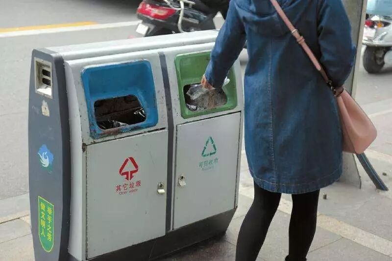 街头可回收/不可回收的分类垃圾箱,形同虚设