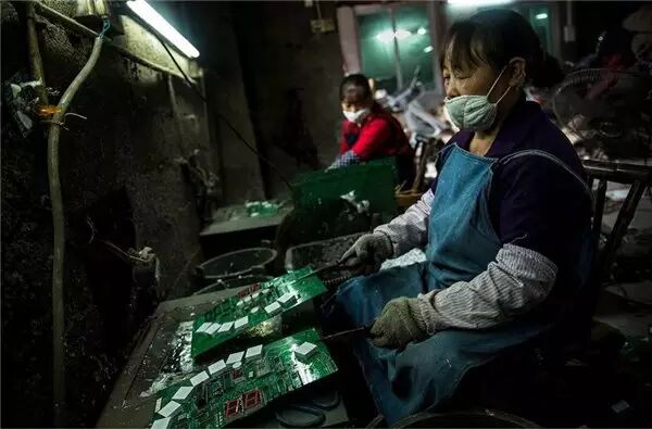 在这个世界闻名的废旧电子电器拆解基地和再生五金塑料的集散地,为了获取可以回收利用的金属和元器件,5000个小作坊用硫酸水冲洗电路板,焚烧废弃垃圾,回收处理着世界各地运来的硬盘、手机以及电脑配件。