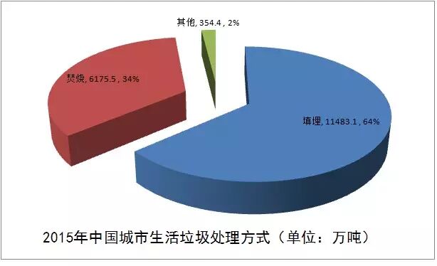 根据《 中国统计年鉴2016》,2015年我国垃圾无害化处理总量18013万吨, 其中填埋量11483.1 万吨,占总量的64%。