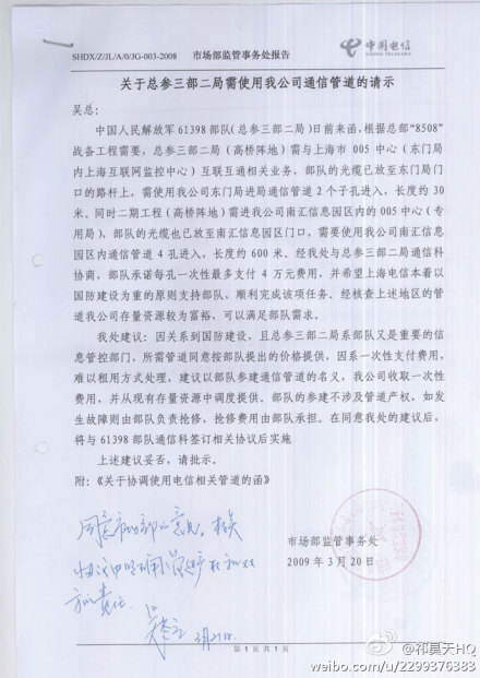我根据郭盈华曾经在上海住过的地址和工作单位,查出61398部队的一些信息,这包括61398部队的地址,部队某些官员发表的学术论文,在浙江大学以及其它大学定向招生的招生广告,还有同中国电信签订的免费使用光纤网络的合同影印件,以及61398部队的一些相关照片和发表的学术论文。