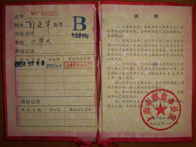 在那期间,我带郭盈华的母亲去过几次朋友家参加聚会。郭盈华母亲不小心对他人说出郭盈华是中国军官。于是,我才仔细回忆,记得郭盈华几次被他人认出她是毕业于上海第二军医大学,还记得郭盈华有许多证件证明她是上海第二军医大学毕业。见下面的献血证。