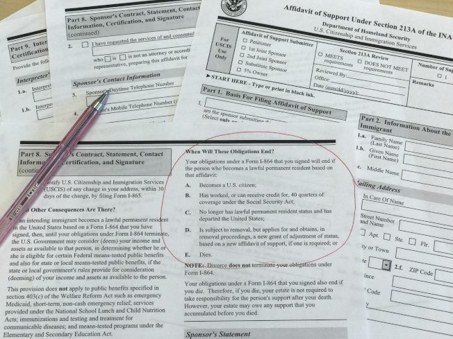 根据申请亲属移民必须填写的经济担保I-864表格中的第八页详列,担保人必须在此份表单上,签名同意负担申请者移民美国后的生活,的经济义务,直到被担保人“成为公民”、“在美国工作十年”、“不再持有绿卡身份或已被遣送出境”、“被列入递解名单”、“死亡”等情况下,才能解除义务,而其中也规定,申请亲属移民的经济担保人除非死亡,否则连离婚都不能因此解除相关责任义务。这份表单,主要证明担保人会尽义务照顾申请者入美国后的生活,以防杜新移民进美国后,靠联邦、州或地方政府各种救济过活,成为公众负担。
