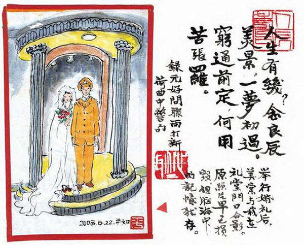 后来,两人在江西大旅社成婚,当时还在旅社门口拍了结婚照。遗憾的是,这张照片遗失了。饶平如按照记忆画了一张,同页相配的是他白发苍苍的单人照片:“时隔六十年,我在南昌再访江西大旅社,伫立于当年拍婚照的门口台阶上,感慨万千。”2008年7月,在老伴去世后的4个月,饶平如拒绝了家人去旅游的提议,执意要回一趟南昌看看结婚的地方。“当年的江西大旅社已经成了南昌起义纪念馆。”饶平如说。