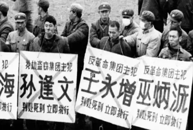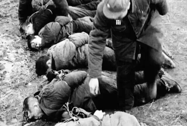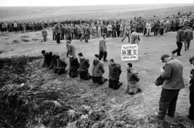 文革枪毙反革命犯之前,法警对犯人施以噤声处置。