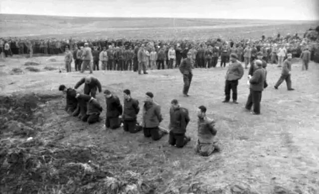 当行刑者退下之后,几个负责执法检验的人立即上前,扯着遭枪击而东倒西歪的尸体的双脚向后拉,摆成整齐的一排,再一一检查每个犯人是否一枪毙命……