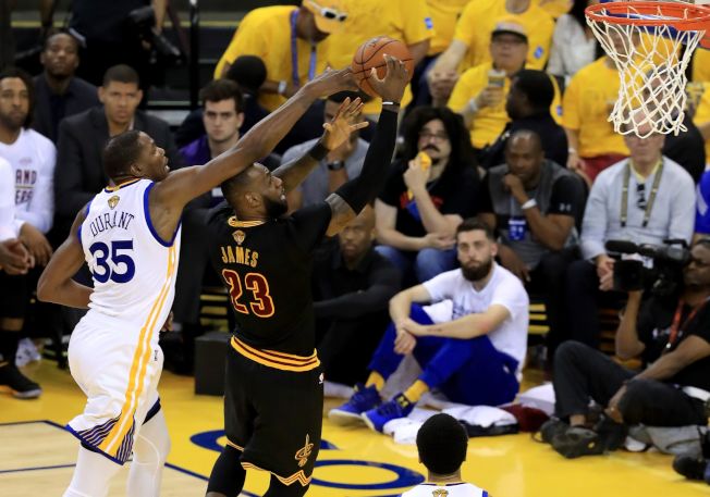 詹姆斯(右)上篮,被后方的杜兰特赏了火锅。(Getty Images)