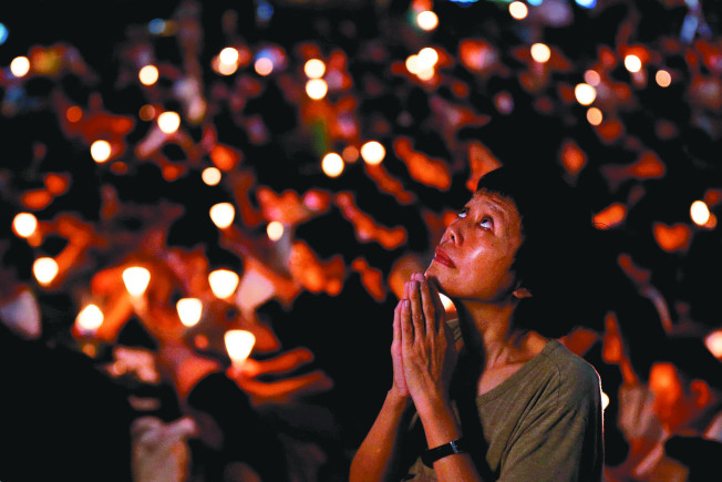 香港市民支援爱国民主运动联合会4日在香港维多利亚公园举办“六四事件”28周年烛光晚会,强调坚持“平反六四”和“建设民主中国”。当晚9时左右,大会方面公布,参加的民众坐满了6个足球场。