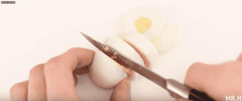 很轻松鸡蛋就一分为二了,切得非常标准!