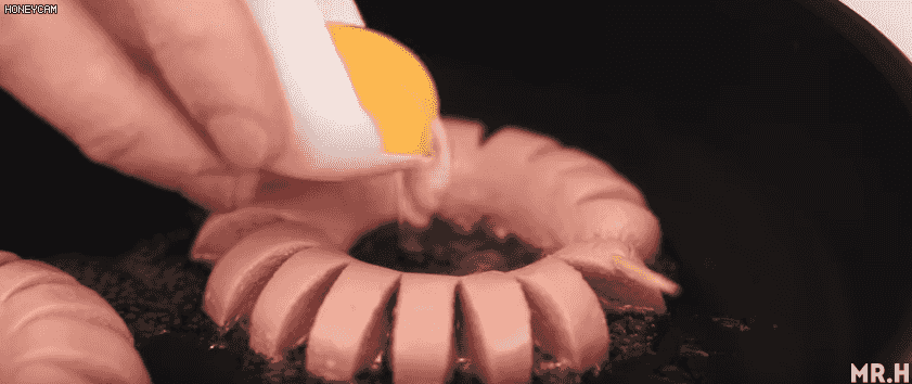 这一招用火腿肠来做也完全没问题,将火腿肠从中间平砍开,从一侧切出小口,然后卷成花形,用牙签固定。放入油锅中,在中间倒上鸡蛋。