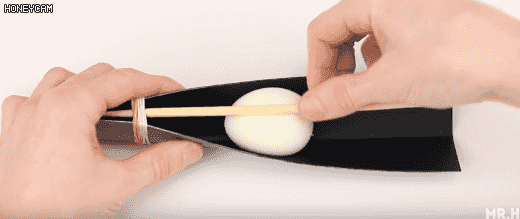 热鸡蛋去壳后,将鸡蛋放一个硬纸板或者塑料壳里,用一根筷子压在中间,然后把塑料壳两段用线绳固定好。