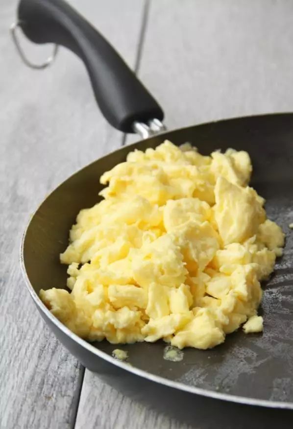 3 用木勺的勺背从锅边刮到中心,不断重复,直到没有蛋液,形成固体。然后关火,再搅拌两分钟,注意搅拌的次序。