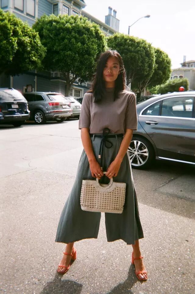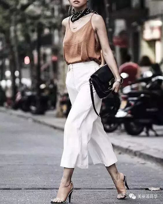 阔腿裤再美,上衣的搭配也不能疏忽,夏日阔腿裤的搭配以清爽为主更加,少一点层次感反倒更胜一筹。