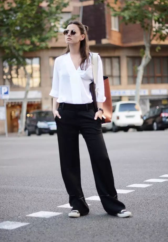 就算正式感比较强的黑白配衬衫+阔腿裤,脚下一双帆布鞋立马休闲了,有种随性慵懒的帅气感。