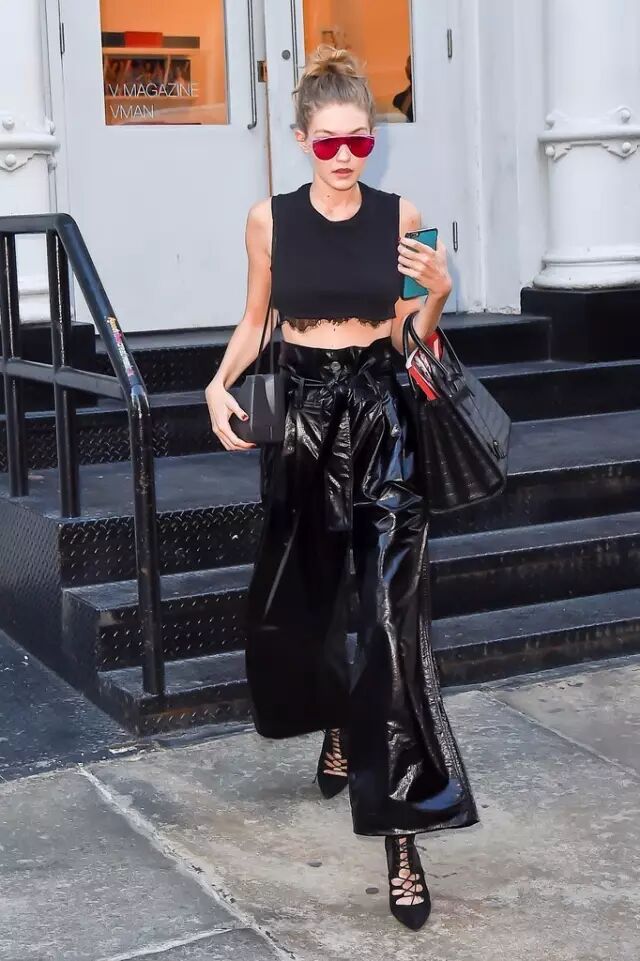 这种穿法很适合上身纤细的女孩子穿,大面积的露肤显得十分清爽,还能衬得脸小几分。上贴身下宽松是阔腿裤的最佳搭配,所以入手吊带衫基本上都能实现这种搭配。