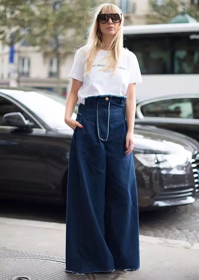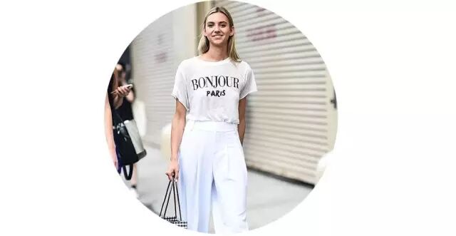 你的白T恤,几乎搭配任何一条阔腿裤都可以,及地长度的阔腿裤,只要打造高腰线,气场立马有。
