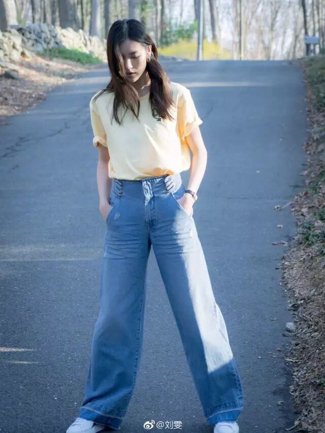 大表姐用T恤搭配牛仔阔腿裤和小白鞋,就很有老美的休闲复古感。