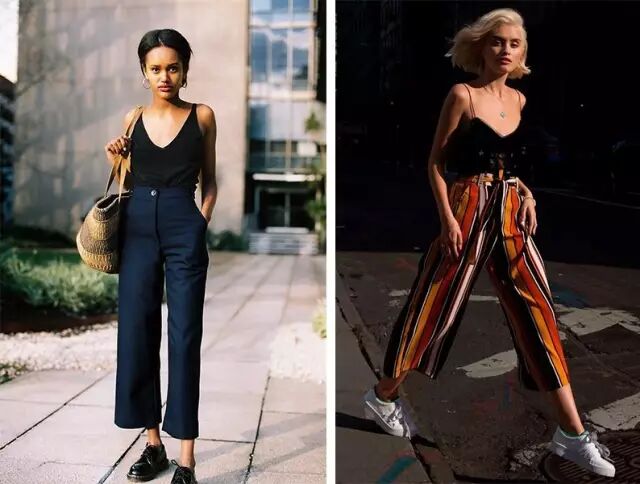 夏天穿阔腿裤,鞋子很重要,基本上决定了你的整体风格,运动鞋和高跟鞋是现在阔腿裤的两种热门搭配,它们所呈现的风格则完全不同。