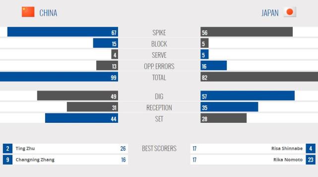 赛后的技术统计显示,中国队扣球得分66-56领先,拦网15-4领先,发球4-5落后,中国队失误送分16分,日本队失误送分13分;个人得分方面,中国队有五位选手得分上双,朱婷砍下全场最高的26分,张常宁16分,袁心玥15分,颜妮和曾春蕾拿到了12分;日本队四人得分上双,野本梨佳17分,新锅理沙16分,荒木绘里香12分,内濑户真实得到了10分。