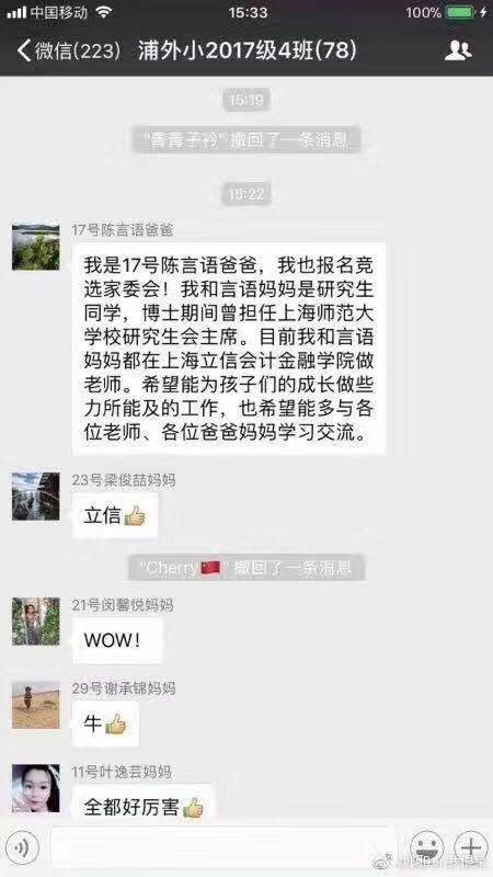 据微信聊天截图显示,事情源于浦外小2017级4班竞选家委会。作为家长想为班集体做点事,想为孩子们的成长做点贡献,这当然是好事啊。
