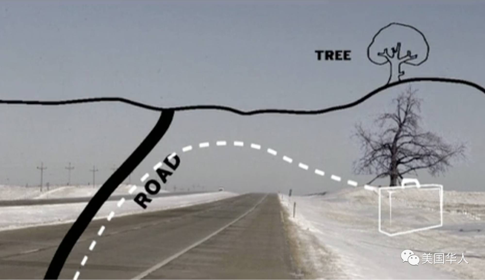 这时小西拿出来一张纸,上面画着一个极其简单的地图:一条大路,还有路边的一棵树。她用手指着地图,反复表示,这是她要去的地方。但是,出了城到处都是这样的场景,她到底是要去哪里呢?这时,她隐约说出来一个词,“Fargo”。