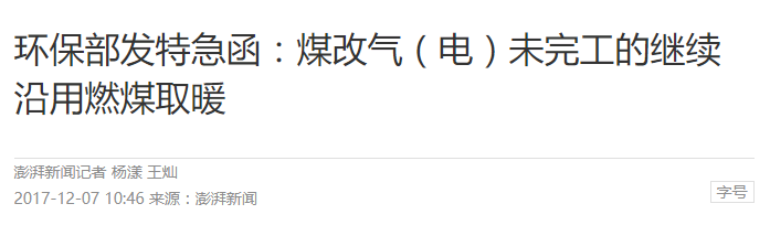 12月7日,据澎湃新闻报道,环保部下发特急函,表示居民可继续烧煤取暖,宣告之前禁煤、取缔散煤的大运动暂告段落。