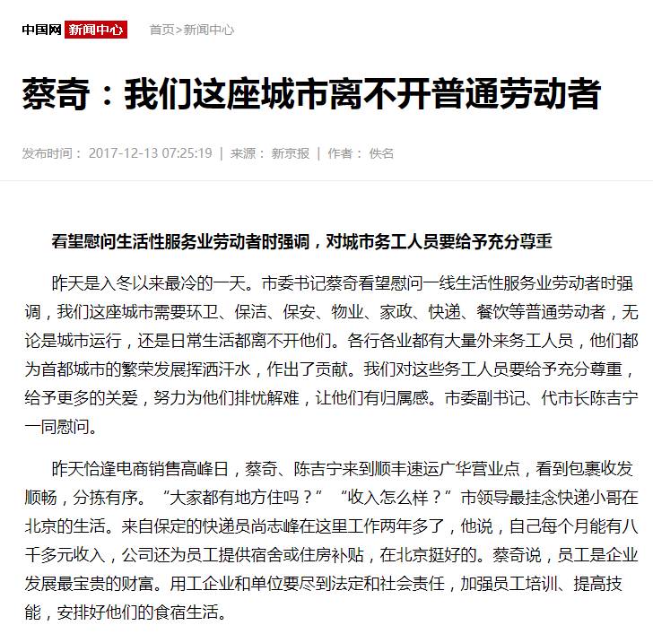 12月12日,这个城市的市委书记走访了一家快递网点,表示这座城市需要环卫、保洁、保安、物业、家政、快递、餐饮等普通劳动者。