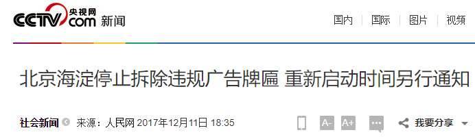 12月11日,人民网报道,北京海淀停止拆除违规广告牌匾,重新启动时间另行通知。北京的靓丽天际线工程在年底暂停,路痴得到了解救。