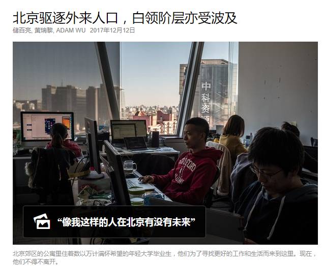 12月12日《纽约时报》报道,码农司若木,拥有编程技术、国外学位、流利英语和一套勉强能容纳咖啡机和两只猫的公寓,本以为自己就是北京在21世纪繁荣发展所需要的有抱负的年轻科技从业者,然而被清出隔断公寓之后,“我现在开始想,像我这样的人在北京有没有未来。”