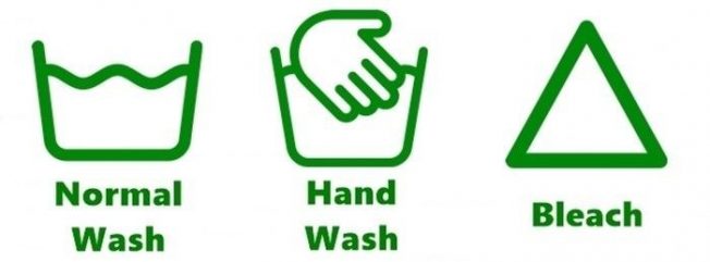 这个长得像篮子的东西,标示了该衣服的洗涤方式,如果是 normal wash,那就表示以一般机洗方式清洁即可。有一只手的话,就代表需要手洗 hand wash 噜。如果看到三角形,则表示这衣服可以漂白 bleach,但如果三角形上有一个大叉叉,那就绝对不能碰到漂白水。让我们看看这些字怎么用: