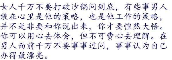女人千万不要试图去抓住男人,抓住男人的人远远不如得到男人的心稳妥。人前教子、人后 教夫,男人活着不光为了金钱,更重要的是为了面子。