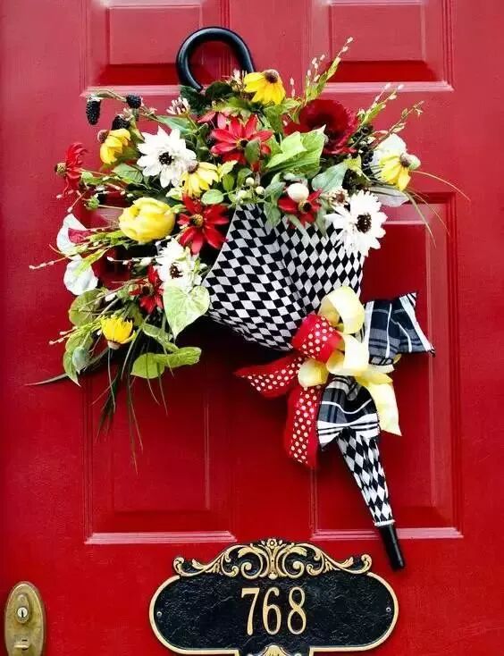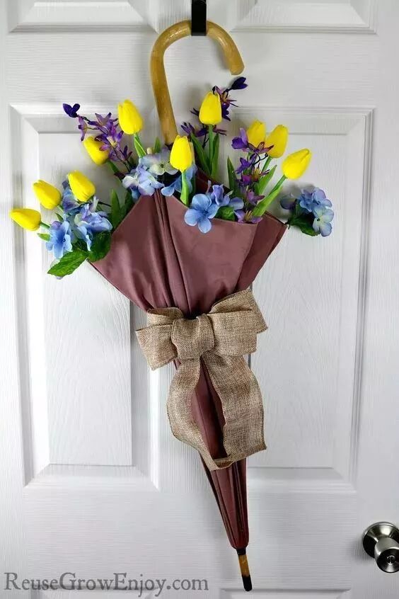 把花朵一根一根插进雨伞,然后找一根宽一点的丝带系上蝴蝶结,挂在门上墙上都特别的好看。