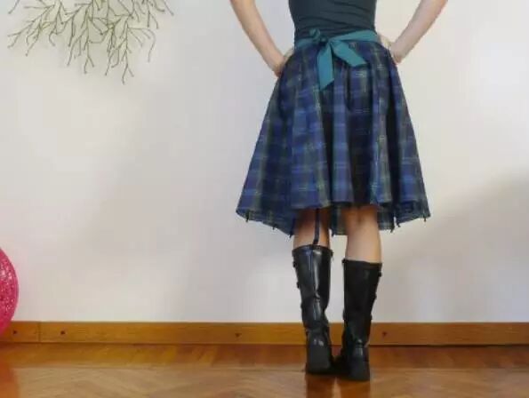 普普通通的深蓝格子伞,这样做一条裙子配上一个绿蝴蝶结腰带,看起来还不错~