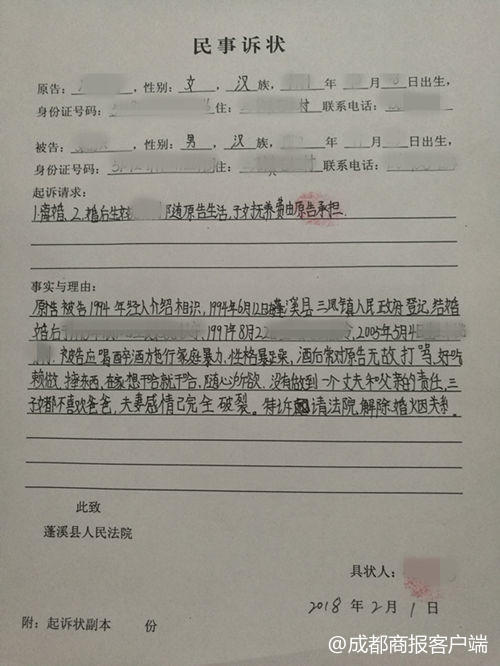 代母写诉状 稚嫩的字迹写了三遍 看着眼前有些害怕的赵楠,旷国军开始询问。 “离婚,是你的意思么?”旷国军问。 “是我的意思,他老是发脾气打人,我也害怕。”赵楠怯怯地答到。 “爸爸一喝酒就凶得很,摔东西,打妈妈,我给妈妈说离婚算了。”小女孩在一旁回答。 在确认了赵楠的请求后,旷国军开始讲解立案的程序,首先赵楠需要写一份民事诉状。但是,文化水平不高的赵楠,几乎只能写自己的名字。于是芳芳自告奋勇,提出代替妈妈写诉状。 旷国军告诉芳芳,写离婚诉状需要写爸爸妈妈什么时候结婚,生育有几名子女,为什么离婚等。在旷国军的指导下,芳芳开始填写着诉状。毕竟从来没有写过,在诉状的“事实与理由”一栏,芳芳废话有些多,逻辑也不太清楚,多次涂改后,第一份诉状不得不废弃。 法官又给了一份,芳芳继续第二次代写。这一次也有问题,仍然有很多口水话,很多字也不会写,涂了又改,改了又涂。 “达不到诉状的要求,”旷国军还记得当时的一幕,他告诉成都商报记者,“(芳芳)写得很认真,但很多口水话,涂涂改改、停停问问,我干脆找了一份其他人的离婚诉状,让她根据爸爸妈妈的情况照着写。”这一次,芳芳写好了诉状。 撤销起诉 爸爸道歉,说以后会慢慢改 “你拉着你妈妈来离婚,不怕回家爸爸打你吗?”诉状写完,旷国军也为芳芳和赵楠的安全担心。 “不怕,爸爸不得打我,而且我们也不得回去,我和妈妈到成都去找大姐。”芳芳说完,和妈妈一起离开了法庭。 看着芳芳和母亲赵楠离去的背影,旷国军心中很不是滋味。当法官多年,他所见所听的,都是父母离婚不愿意孩子参与的情况,他还是第一次见到孩子拉着妈妈来法院,还代妈妈写诉状离婚。 “如此懂事的小女孩,怎么就不能拥有一个完整的家庭呢?”旷国军心中这样想着,拿起了电话,拨通了芳芳爸爸廖辉的电话。电话中,旷国军告知对方,妻子赵楠已经提起离婚诉讼。旷国军还在电话中对廖辉狠狠训诫了一番。 2日,法官旷国军告诉成都商报记者,第一次电话中,廖辉态度仍然比较强硬,法庭不得不正式立案,并于2月24日开庭审理此案。不过,开庭那天,赵楠和廖辉都没有出现。最终,赵楠撤销了起诉。 成都商报记者后来了解到,从法庭出来后,赵楠和芳芳确实没有回家,不过也没有到成都。用芳芳的话说,她们“不想让姐姐担心”。随后,母女俩在亲戚家住了两天。期间,廖辉给赵楠打了多次电话,但赵楠一直没接。他四处给亲戚打电话,一直没人告诉他母女两人在什么地方。 不过,两天后,赵楠还是回家了。要过年了,她还是担心廖辉一个人把家弄乱了,想回去收拾一下。“回去后他就给我道歉,说当时太冲动了,以后会慢慢改。她也叫我不要说太多,他都知道,只是多年来形成的性格,需要慢慢改变。”2日,赵楠告诉成都商报记者,对于离婚,她是犹豫的,虽然大女儿、二女儿都已经成年了,但芳芳还小,家里经济条件又不宽裕,如果离婚了,又要出去租房等,“不仅经济上有更大的压力,不完整的家庭对芳芳也不好”。 爸爸变了 三个月没发脾气,还给妈妈买手机 刚刚过去的五一假期,12岁的芳芳每天在家买菜做午饭和晚饭,做好后高兴地等候在外打工的父母回家吃饭。1日上午,廖辉外出上班前,拿了800元钱给妻子赵楠,让她去买一部新手机,又给了即将上学住校的芳芳200元钱。不过,芳芳把200元钱给了妈妈。 看着爸爸的举动,芳芳心中很高兴。几天前,妈妈随意说了一句想买部新手机,爸爸当时并没有表态,但最终用实际行动进行了回应。 2日中午,成都商报记者与法官一起,在蓬溪县某小学见到了读六年级的芳芳。芳芳个头不高,但性格活泼开朗,她一眼就认出了法官旷国军,口中喊“叔叔好”。 谈起现在爸爸妈妈的关系,芳芳露出了笑容。她告诉成都商报记者,现在爸爸可好了,很少喝醉酒,即使喝醉酒后,回家也是倒头就睡觉,不再和妈妈吵架,更不会打妈妈了。 “他以前经常半夜三更喝醉酒回来,有时还两三天不回家,现在天天在外面上班,天天都要回家了。而且每次外出和朋友相聚,他都会给妈妈‘请假’,要买裤子时,还会拉着妈妈陪他一起,而且必须要作出参考意见。”芳芳高兴地说,“到现在为止三个月,爸爸都没有发脾气打人。” 在芳芳的带领下,成都商报记者在一处工地,见到了正在做杂工的妈妈赵楠。赵楠不善言谈,有点怯生,但说起廖辉的改变,还是露出了笑容。 “他以前喝醉酒打我,找借口是没有儿子,其实主要是好吃懒做,他现在改了好多,每天在工地上当砖匠,工资也交由我保管,他自己只留一两百元买,当做买烟的零用钱。”赵楠笑着说道,“有时也会争吵两句,但都是笑嘻嘻的,他真的在改。” 采访中,赵楠将这一功劳归功于芳芳。说到这里,芳芳笑着挽起赵楠的手臂,头靠在了妈妈的肩上。成都商报记者本想联系一下赵辉,但母女二人一致希望,千万不要和廖辉联系,她们担心廖辉反感媒体,担心美好生活刚开始又结束。法官也建议记者不去打扰赵辉,毕竟刚刚修复3个月的关系,还比较脆弱。 对话芳芳: “ 希望有个完整的家, 更希望有个和睦的家” 成都商报:爸爸打过你吗?爸爸打妈妈时你会帮妈妈吗? 芳芳:爸爸没有打过我,而且还比较听我话,他每次打妈妈时,我都会很生气地告诉他,他们吵架打架影响我休息了,如果我考试考不好,就要怪爸爸。很多时候我说了这些爸爸都会听,但他就是改不掉醉酒后打
