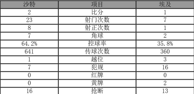 此役沙特比埃及踢的更为积极,他们更想拿下这场比赛,并最终如愿完成了绝杀。数据来看,沙特射门23比7,射正8比1,角球7比2,控球超过6成。沙特今天是表现更好的球队,配得上这场胜利。