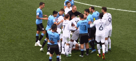 但是法国队球员并不这么认为,眼见自家10号被围在中间,他们马上冲过来为队友打抱不平。吉鲁一直在拉着戈丁不让他接近姆巴佩,而其他法国球员也基本上以拉架为主。此时之间人群中冲进来一个大黑塔,法国中场博格巴为了给队友打抱不平,冲入人群与乌拉圭球员发生了口角,他甚至还给了身材矮小的乌拉圭中场南德斯一掌,不过主裁判并没有看到博格巴的动作。