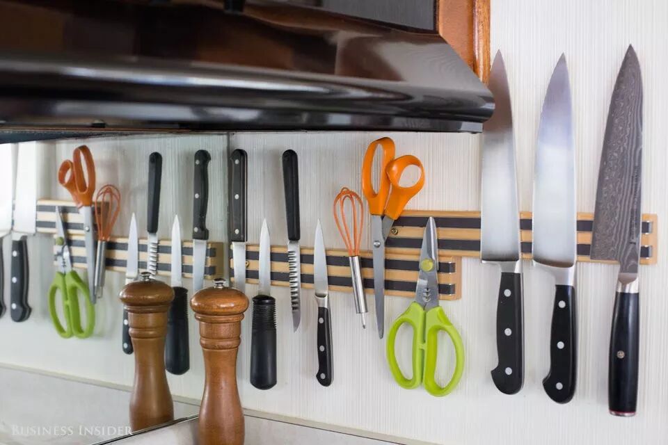 因为厨房没有多余的储存空间,夫妇俩的厨用工具都是用磁铁吸在墙上的。当然,如果要出海,他们会在遇到风浪前,把这些工具收起来。