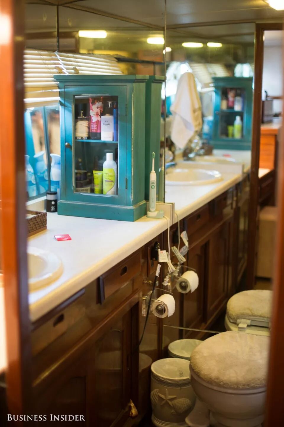 令人难以置信的是,船上竟然有3个卫生间。船上自带的脱盐水槽,一次最多可以为淋浴间、洗手池和马桶提供800加仑的淡水。