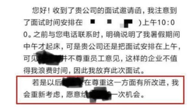 第一封对面试邀请的回复里写着“我注意到了面试的时间是上午10:00。之前与您电话联系时,明确说明了我暑假期间中午才起床,可是贵公司还是把面试安排在上午,可见贵公司并不尊重员工意见…因此我放弃此次面试”,之后再补一句惊人之语,“若是贵公司在尊重这一方有所改进,我会重新考虑,愿意再给一次机会”。