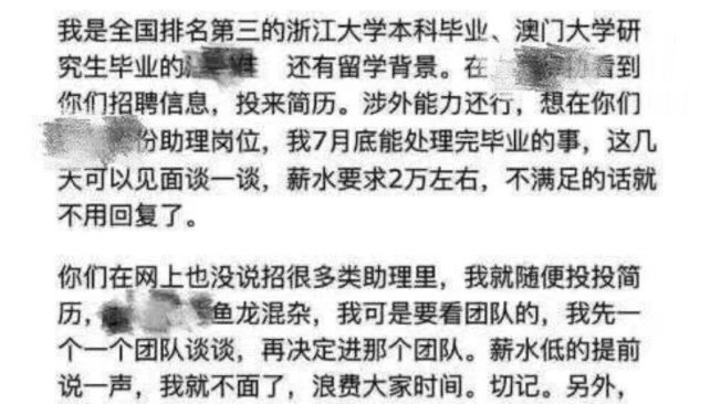 为了节省双方宝贵的时间,求职者先说明自己的月薪要求为二万人民币(约3000美金),不满意就不用回复了。图翻摄网络
