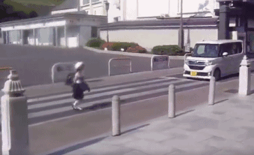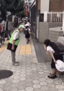 过马路时,日本孩子给让路的司机鞠躬表示感谢。
