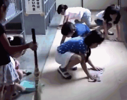 在学校,日本的小学生除了正常值日外,还要负责打扫教学楼走廊等公共区域的卫生。