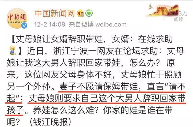 前不久引起大讨论的话题:由于种种原因,岳母要求男人辞职在家带孩子,女婿委屈地上网求助。